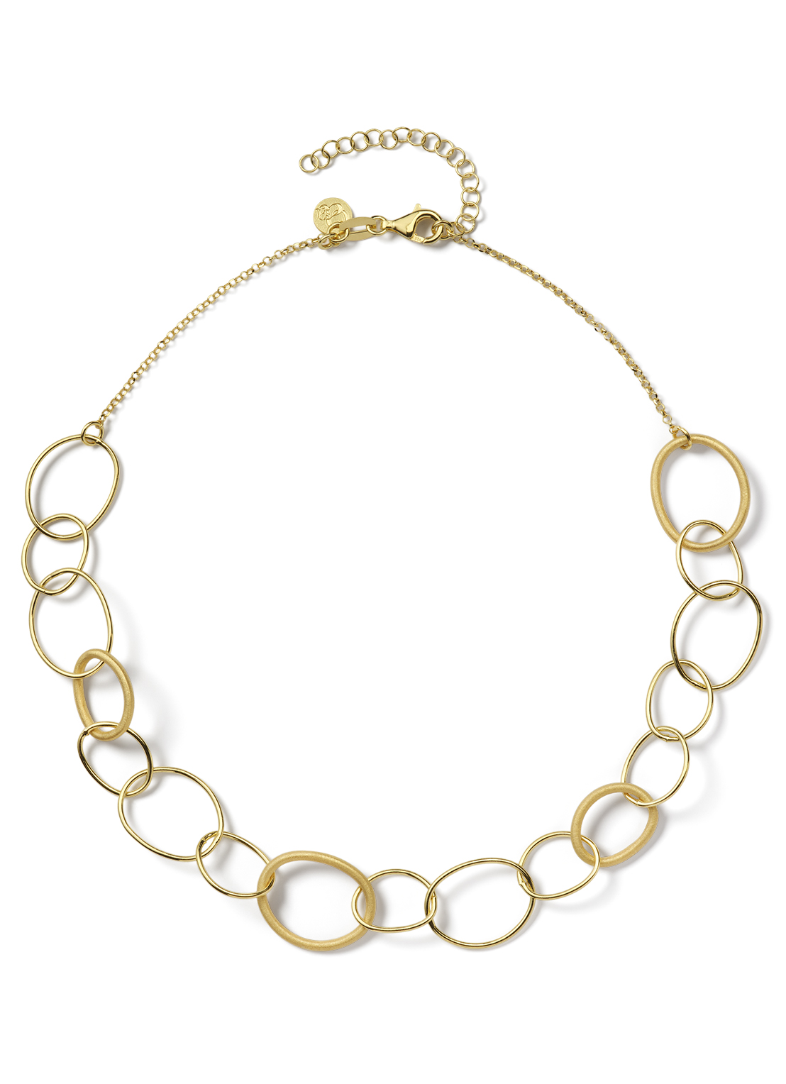 Goud verguld zilveren statement collier met gesatineerde en shiny ringen, lengte 38 + 5 cm