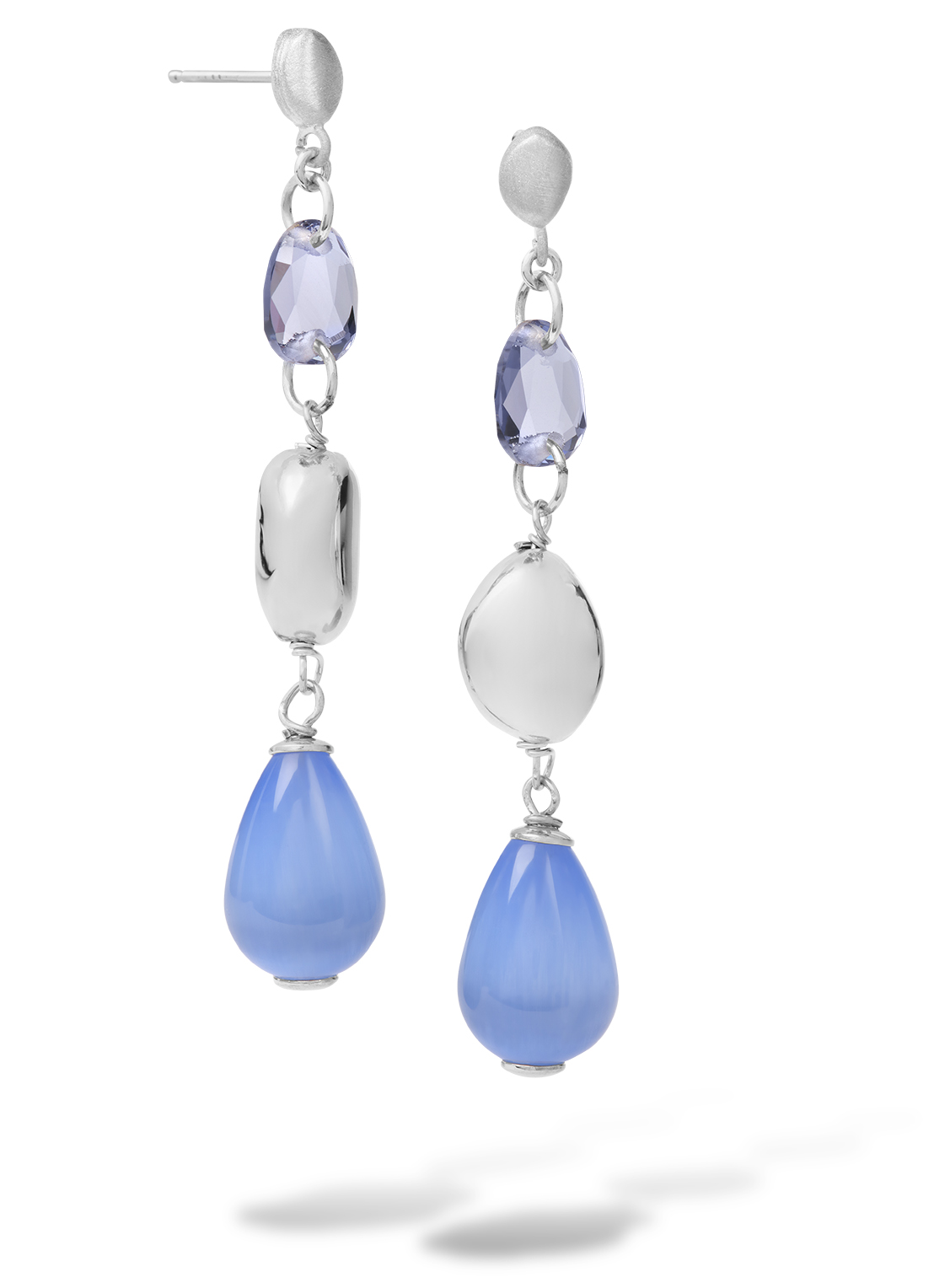 Zilveren statement oorhangers met steker, met blauwe zirkonia steen en parel, lengte 60 mm