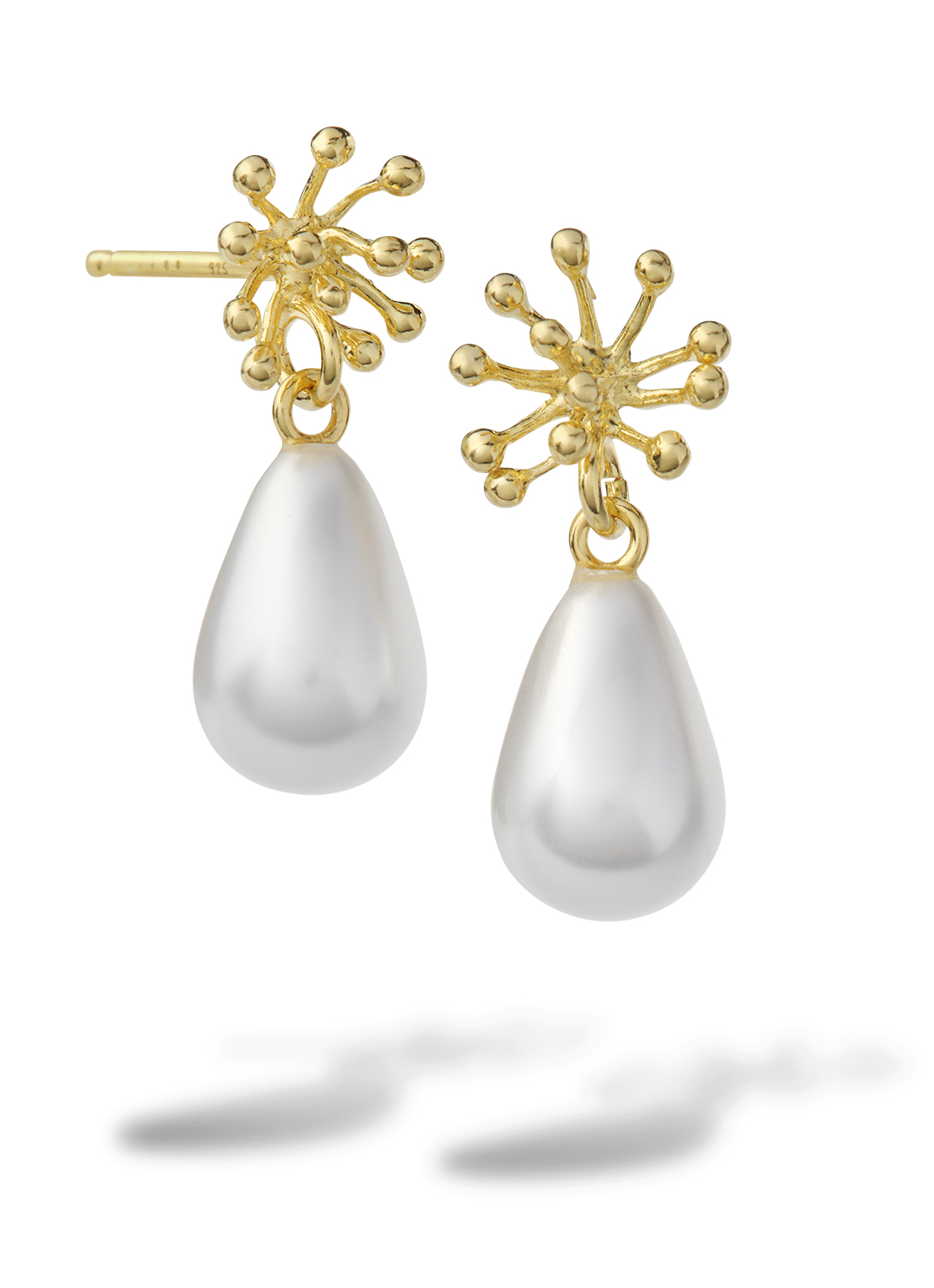 Goud vergulde oorhangers met steker en witte synthetische parel, lengte 20 mm